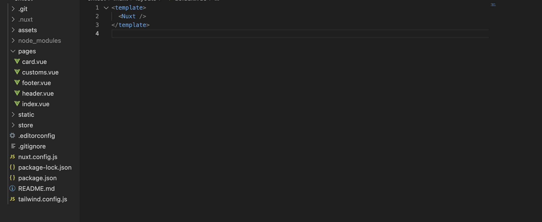 그리고 router-view 역할은 layouts 내 default.vue안 <Nuxt/> 가 대신해줌을 알 수 있다.