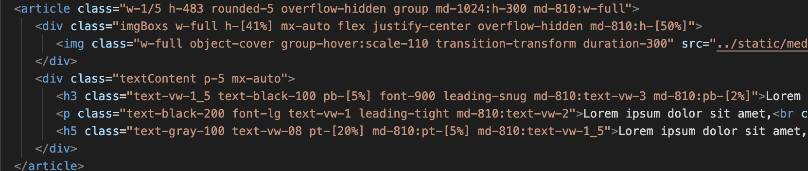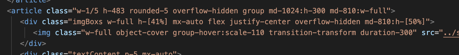 article 요소에 group을 주고 자식요소내 img에 grop-hover:적용요소를 주었다. 위 코드의 경우 article에 hover시 이미지가 tranfrom:scale(1.1)을 하는 효과를 가진다.