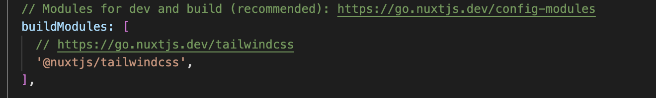 - nuxt.js 2.15.8 버전을 사용하면서 프로젝트 생성시 환경설정을 통해 tailwind.css를 설치했으므로 자동으로 설치, 설정이 되었다.
