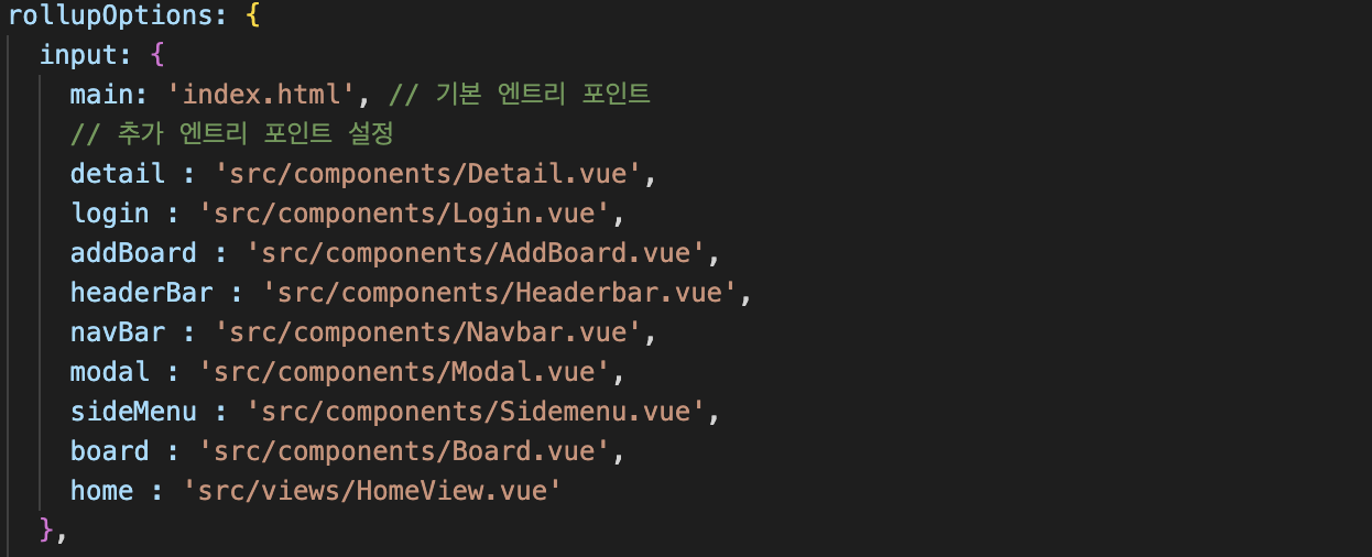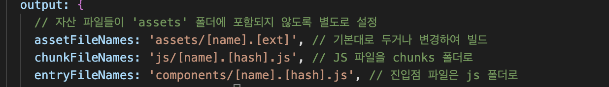 rollupOptions내 output을 따로 설정해 이미지와 css, js파일을 구별 설정을 따로 작성하였다.