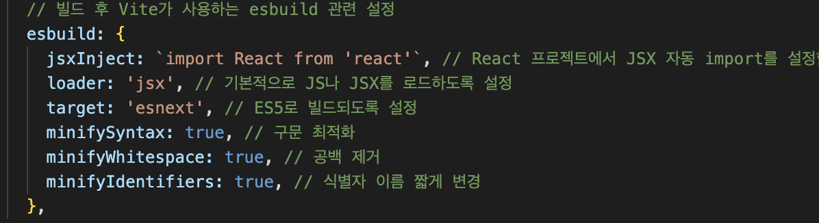 그래서 target에 설정을 esnext로 바꾸고 esbuild 관련설정도 이처럼 바꿔주었다.