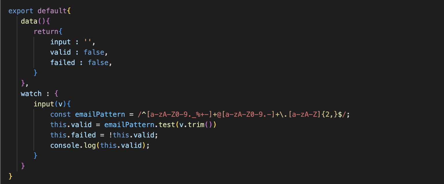 input(v)를 통해 들어오는 value값이 emailPattern 조건에 부합하는 경우, valid값은 true가 되고 failed 값의 경우 늘 valid의 값을 부정하므로 value값이 조건문을 부합하지 않는 경우 true값을 반환한다.