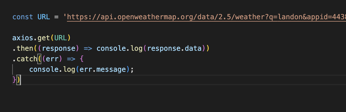 그러나 axios의 promise는 상태코드가 2xx의 범위를 넘어가면 거부한다. 에러 객체에 응답(response)또는 요청(request) 프로퍼티가 포함되어 있는지 확인하여 에러에 대한 자세한 정보를 알 수 있다.