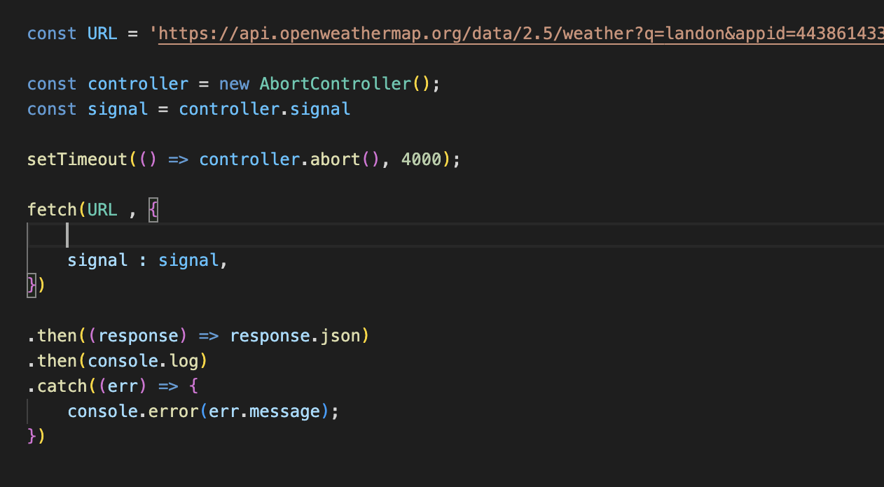abort 메소드가 호출 될 때마다 fetch 요청이 종료된다. setTimeout 기능을 사용하여 서버가 4초이내에 응답하지 않으면 작업이 종료된다.