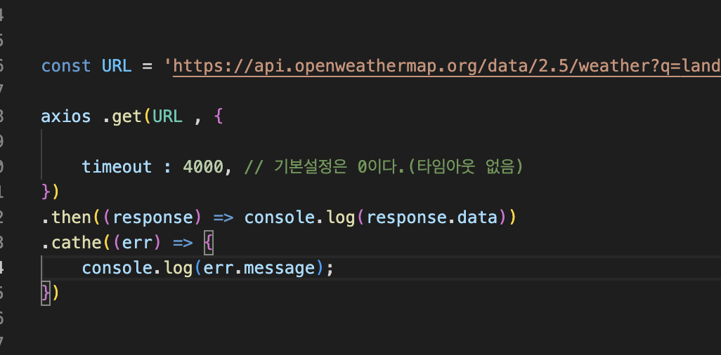 axios의 경우 timeout 속성을 설정 객체에 추가하여 요청이 종료될 때까지 시간을 밀리초로 지정할 수 있다.