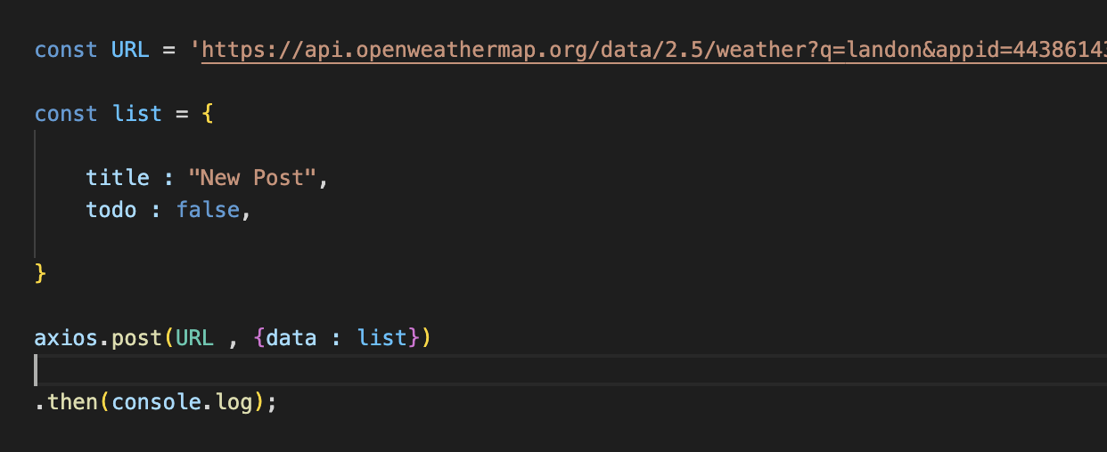 axios로 post 요청을 할 때, 요청 본문(request body)으로 보내고자 하는 data는 data 프로퍼티에 할당한다. 컨텐츠 유형 헤더의 경우도 설정할 수 있다. 그러나 기본적으로 axios는 Content-type 을 application/json으로 설정하므로 생략이 가능하다.