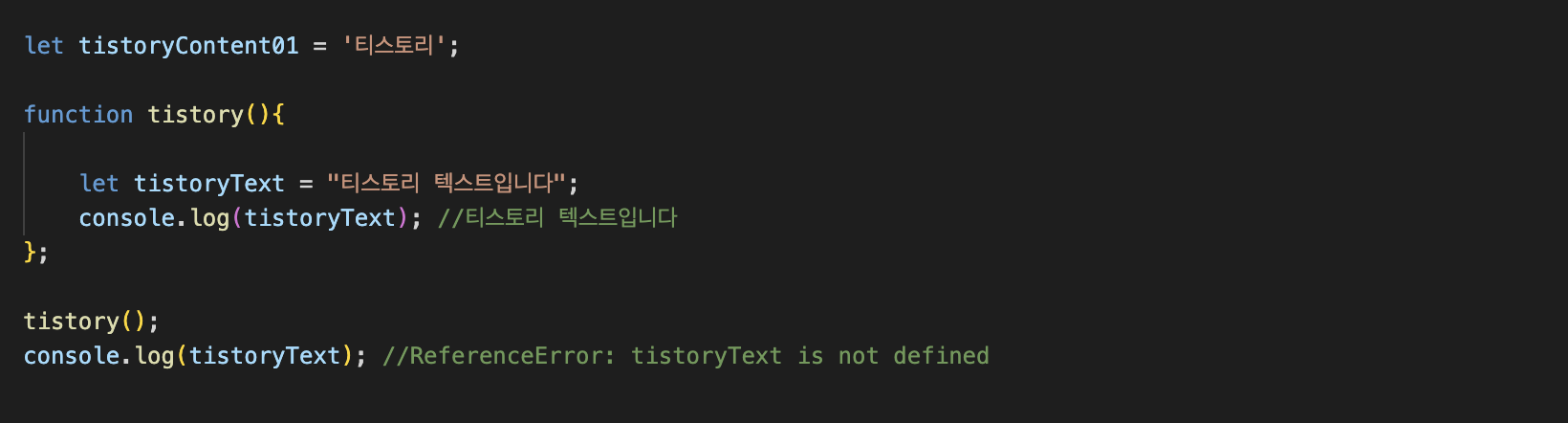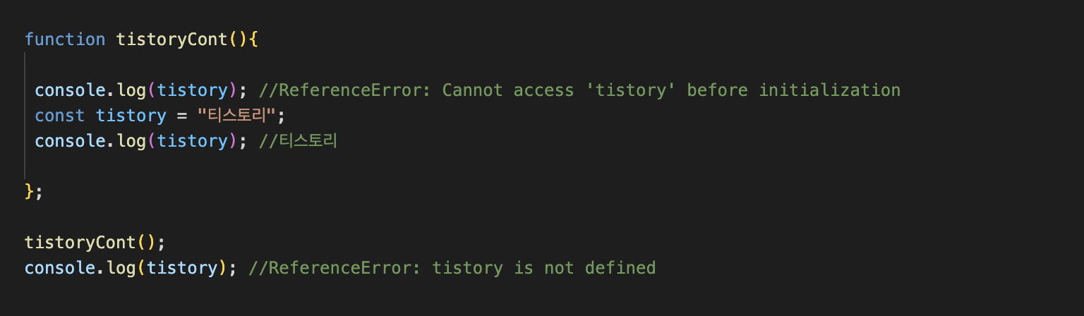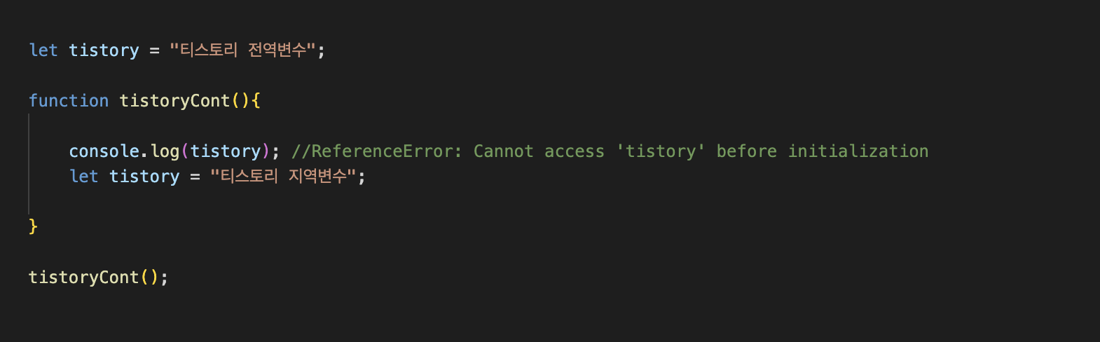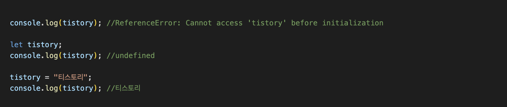 ** let tistory (선언) => 선언단계 => 일시적 사각지대(TDZ - Temporary Dead Zone) => 초기화단계 (tistory == undefinded) >> tistory = 1; (할당) => 할당단계 (tistory === 1) **