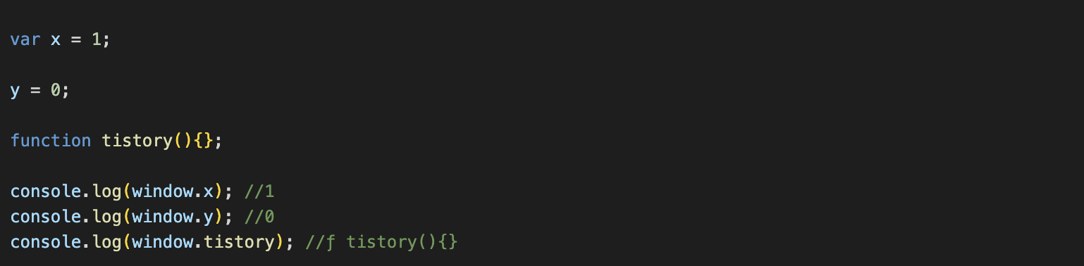 var키워드로 선언한 전역변수와 전역함수, 그리고 선언하지 않은 변수에 값을 할당한 암묵적 전역은 전역객체 window의 프로퍼티가 된다. 전역 객체의 프로퍼티를 참조할 때 window를 생략할 수 있다.