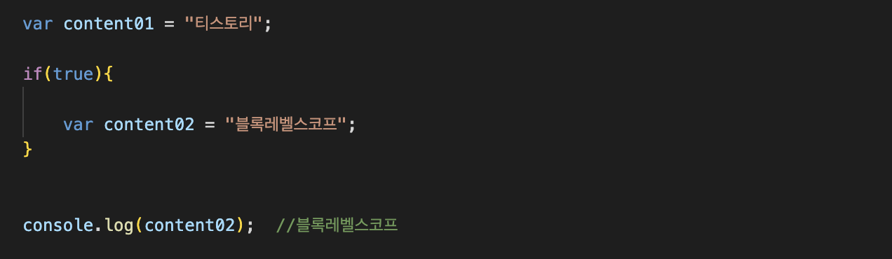 var의 가장 큰 특징 중 하나는 함수레벨스코프를 지향하므로 함수외에 코드블록에 선언한 변수명들은 전부 전역변수가 된다.