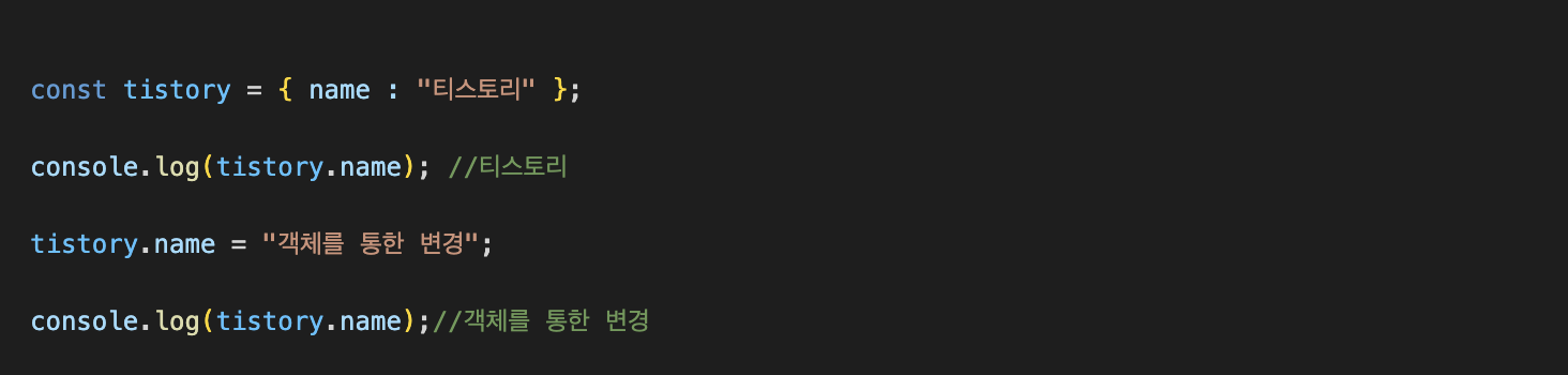 const는 값을 재할당하는 것을 금지할 뿐 불변을 의미하지는 않는다. 다시 말해 새로운 값을 재할당하는 것은 불가능하지만 프로퍼티 동적 생성, 삭제, 프로퍼티 값의 변경을 통해 객체를 변경하는 것은 가능하다. 객체가 변경되더라도 변수에 할당된 참조값은 변경되지 않는다.