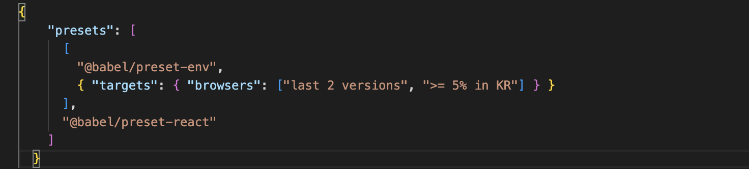 .babelrc 파일을 생성하고 바벨 관련 설정을 지정한다.