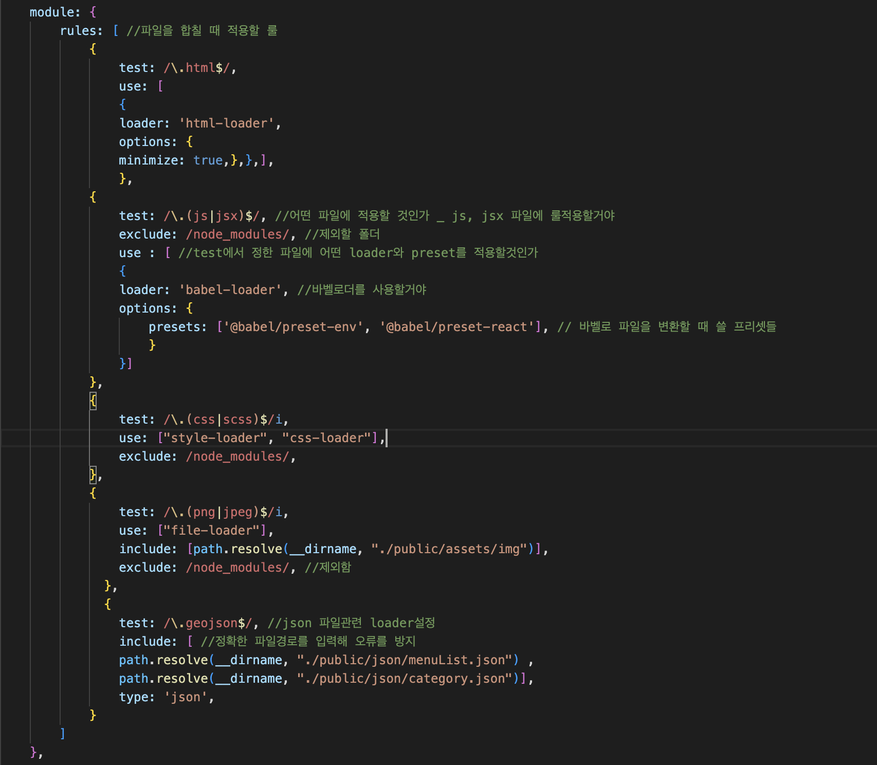 주의할 점은 config에 바로 rules 속성을 쓰는게 아니라 반드시 module.rules에 정의해 주어야 한다는 것이다. (틀리면 웹팩이 알아서 경고해주기는 한다.)