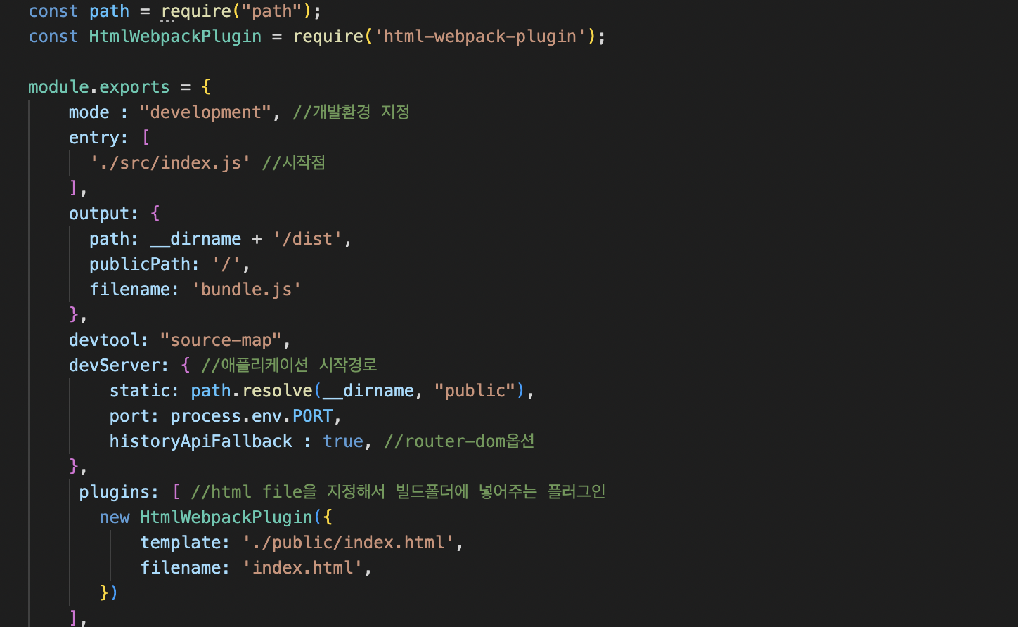webpack.config.js 파일내 template에 원본으로 사용할 HTML 문서 경로를 넣어주면된다. 이 플러그인을 사용하지않고 빌드하면 dist 디렉토리에 html파일이 생성되지 않는다. -> dist 디렉토리 내의 빌드결과물만으로는 렌더할 수 없음을 의미.