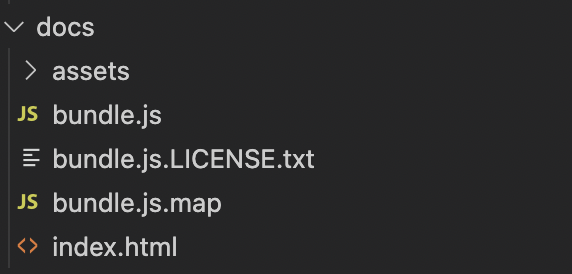 그럼 아래와 같이 docs 라는 폴더내에 assets을 포함한 index.html 파일과 js 파일이 함께 들어온다 -> 이전에는 assetes 파일이 만들어지지 않아서 이미지 로더가 되지 않았었다.