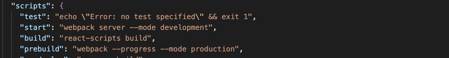 이렇게 작성 한 뒤, 다시 npm run prebuild 를 입력하면 _ ( 본인은 편의상 build는 react-scripts 로 작성하고 웹팩 build는 prebuild로 임시 설정해두었다. )
