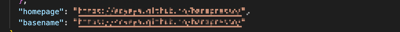 3. 그리고 혹시몰라서 package.json 내의 homepage 와 basename을 깃io / 레포지토리스로 설정해주었다 >> 배포할 사이트명으로 설정